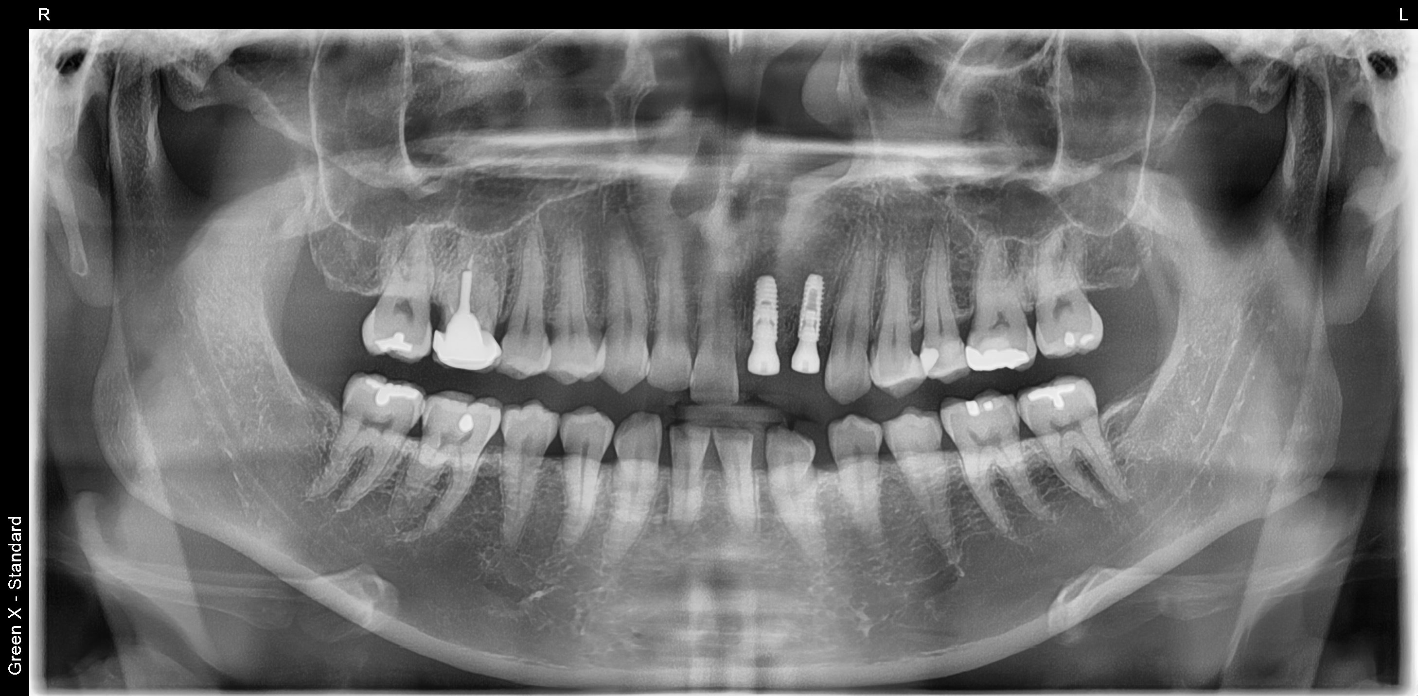 엑스레이 사진을 찍어보니 앞니 2개의 뿌리에 염증이 심하여 발치 당일 잇몸뼈 보존을 위하여 치조골 이식술을 먼저 진행하였습니다.
