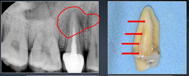 <!-- 이미지 3 -->[사진] - 왼쪽: 뿌리끝 부위에 염증 음영이 관찰되는 X-ray, 오른쪽 :발치 후 치근까지 진행된 균열이 보임