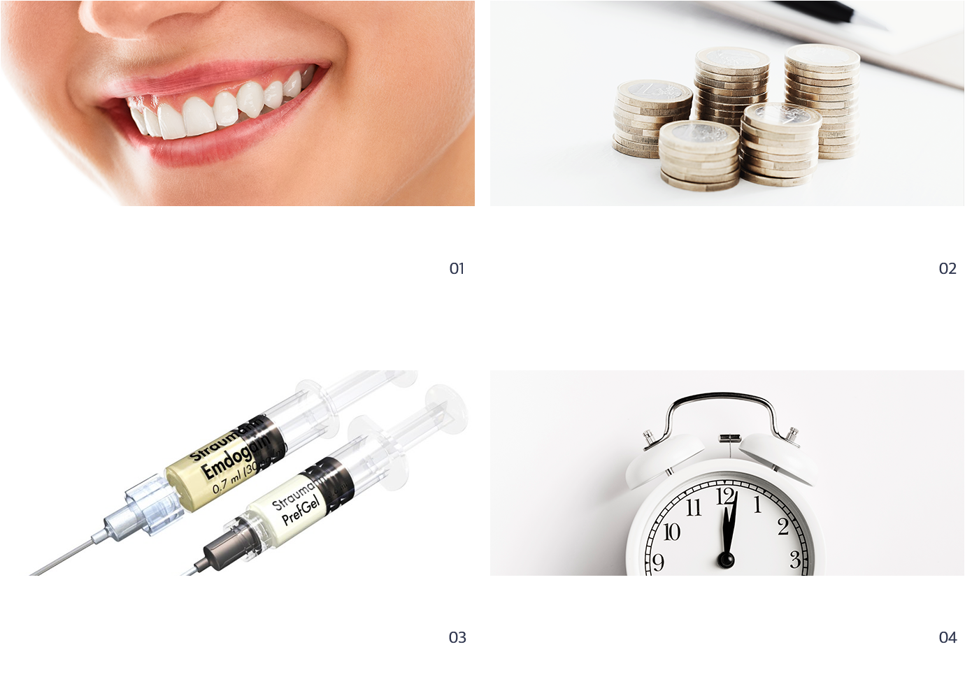 엠도게인은 치주조직의 생성을 촉진하는 법랑기질단백질을 상품화한 제품으로 치주조직이 손상된 치아의 치근면에 적용시 백악질의 생성을 촉진합니다.