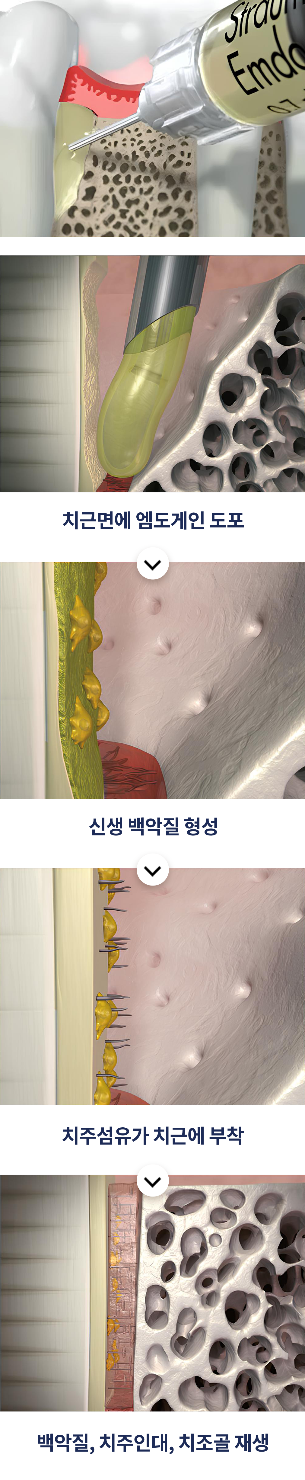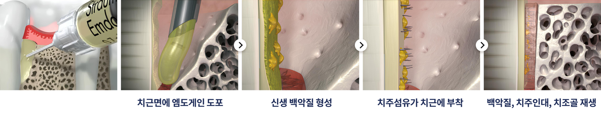 백악질은 치주조직의 재생에 있어서 아주 중요한 부분으로 치아의 치주인대의 부착에 필수적인 부분입니다. 엠도게인은 여러 임상 연구에서 그 효과가 충분히 입증되었으며 현재까지 특별한 부작용이 보고되지는 않았습니다.
