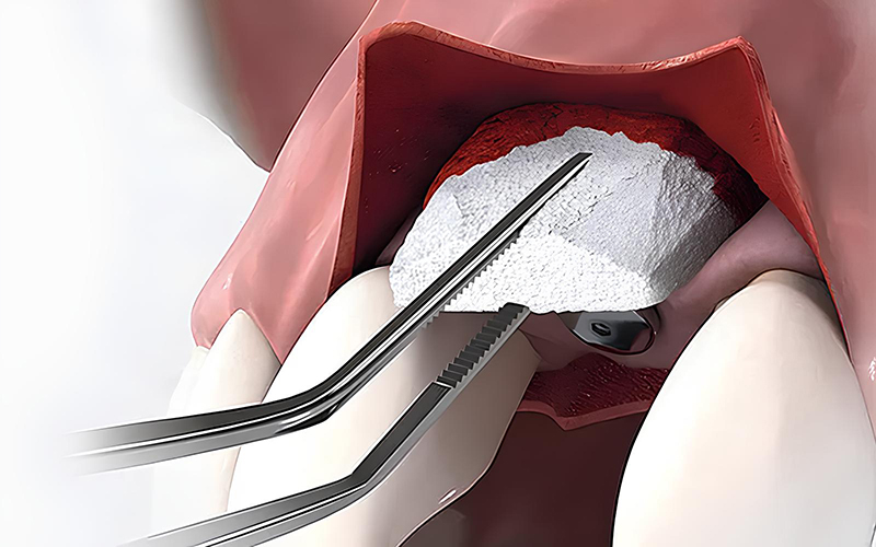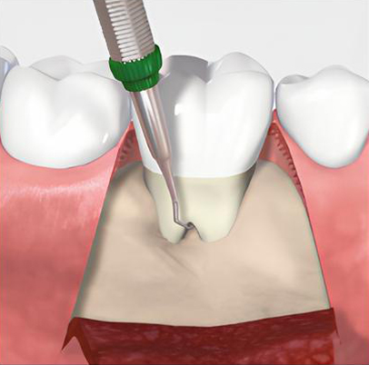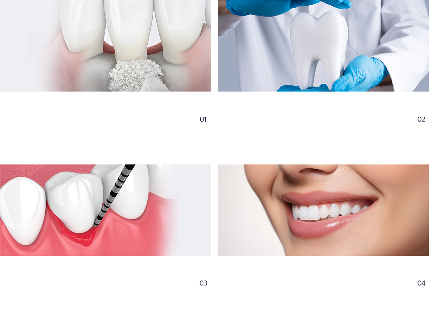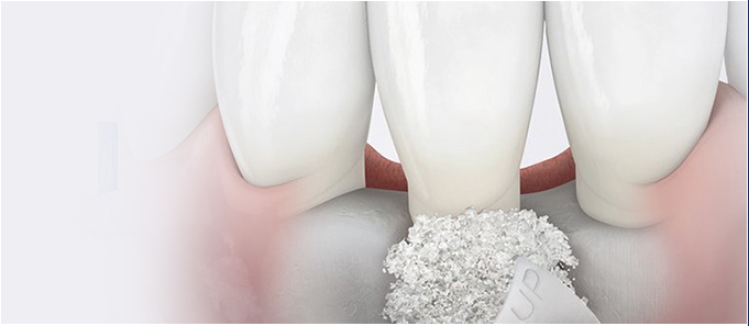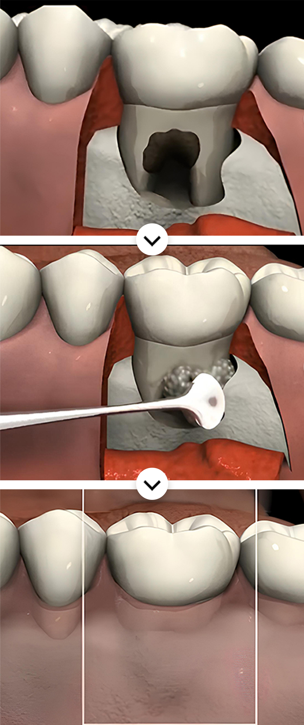 치주염으로 흡수된 잇몸뼈를 인공뼈로 채워주어 세균증식의 원인이 되는 치주낭을 제거하고 치조골을 재생시켜주는 치료입니다.